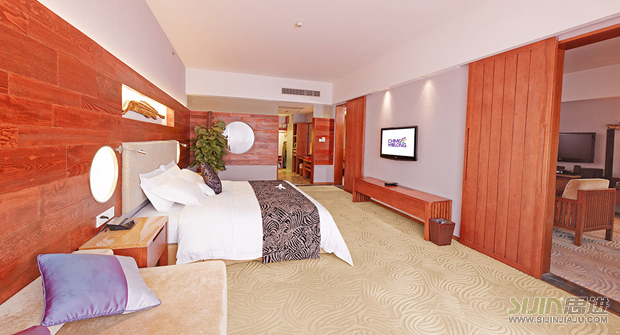 廣州長(zhǎng)隆酒店客房家具白虎房樣式:紋理清晰唯美的原木墻壁,行走在與之相呼應(yīng)的紋路毛毯,觸摸那繡上雪虎花紋的被褥,你是否也有一種走進(jìn)了高貴雪虎所生長(zhǎng)的森林似的錯(cuò)覺(jué)?