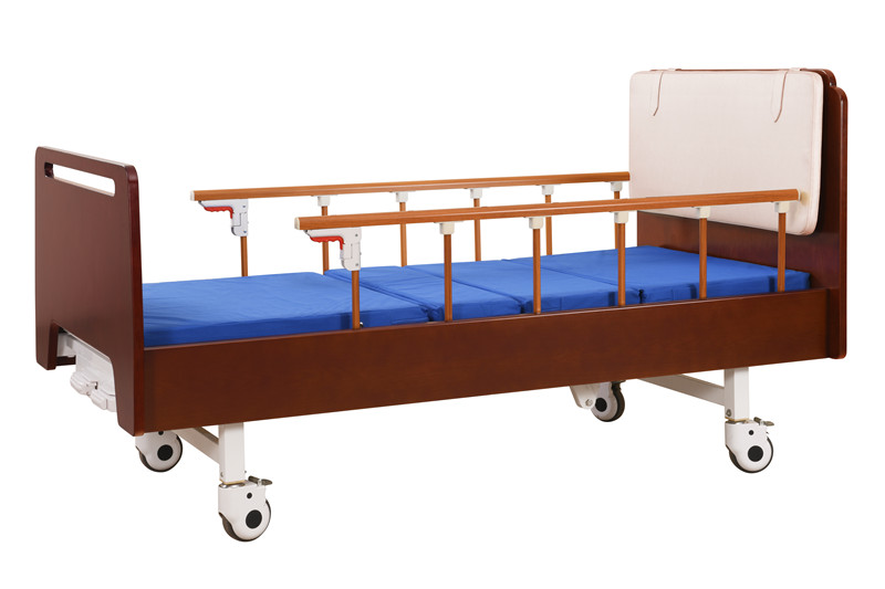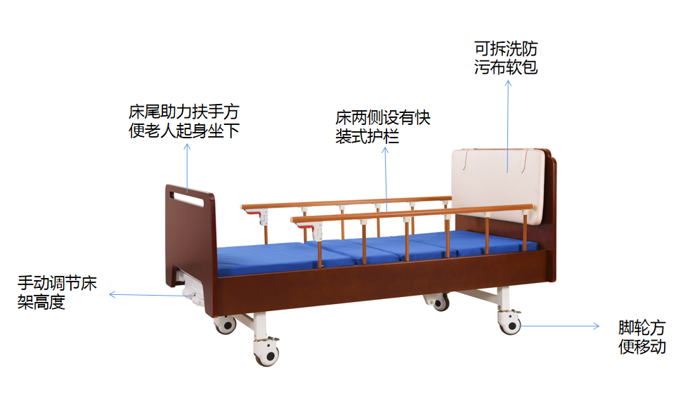 護(hù)理床 基材:為實木白蠟?zāi)究蚣芙Y(jié)構(gòu) 大圓角設(shè)計,安全,保護(hù)您的老人住戶不易受傷; 床尾可作為扶手使用,還可防止被子掉落等,方便護(hù)理; 床底鏤空設(shè)計,方便清潔地面以及防潮; 實木框架結(jié)構(gòu),經(jīng)久耐用 手動調(diào)節(jié)床架高度